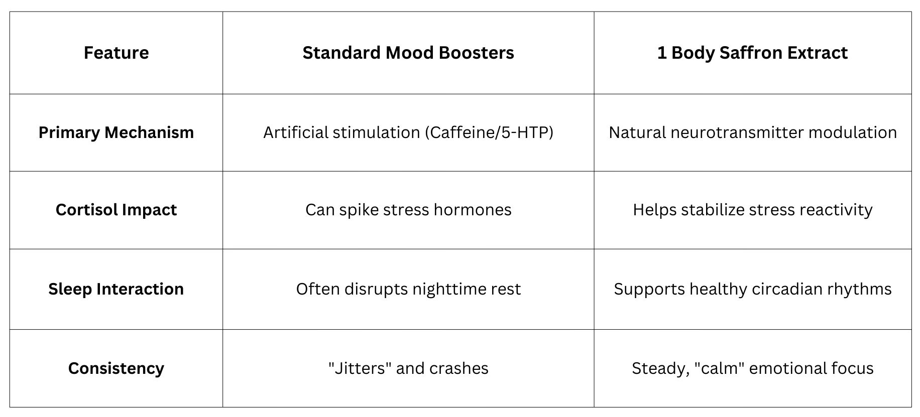 Unlike stimulants that force a temporary spike in energy followed by a crash, 1 Body Saffron Extract works by modulating neurotransmitter reuptake. It helps keep serotonin and dopamine available in the brain for longer periods, smoothing out the emotional "dips" that occur during stress or low-light months.