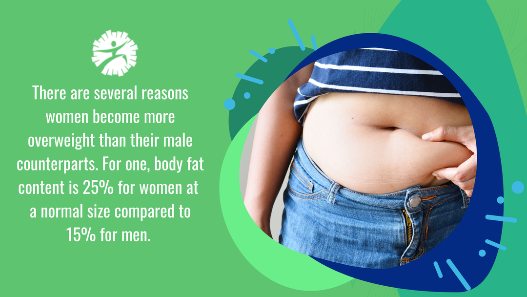 Women are more likely to become obese than men, which can impact joint health and function. According to a study by the CDC, "Across all adult age groups, about 38 percent of women are obese, while 34 percent of men were obese." There are several reasons women become more overweight than their male counterparts. For one, body fat content is 25% for women at a normal size compared to 15% for men. Plus, for many women who have been on birth control, the additional estrogen can cause weight gain.Â