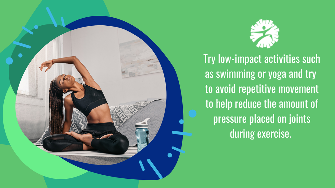By strengthening the muscles surrounding the joint, you can help reduce the amount of stress placed on the joints. Try low-impact activities such as swimming or yoga and try to avoid repetitive movement to help reduce the amount of pressure placed on joints during exercise.Â