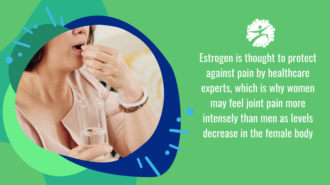 Estrogen plays a key role in both cartilage health and pain management, which both play a huge role in joint pain. Cartilage is the strong, flexible tissue in between our joints, and is 65–80% water. When estrogen levels decrease in the body, so does the amount of cartilage cushion. Every month, levels of estrogen plummet with women's menstrual cycle, as well as later on in life with menopause. In addition, estrogen is thought to protect against pain by healthcare experts, which is why women may feel joint pain more intensely than men as levels decrease in the female body.