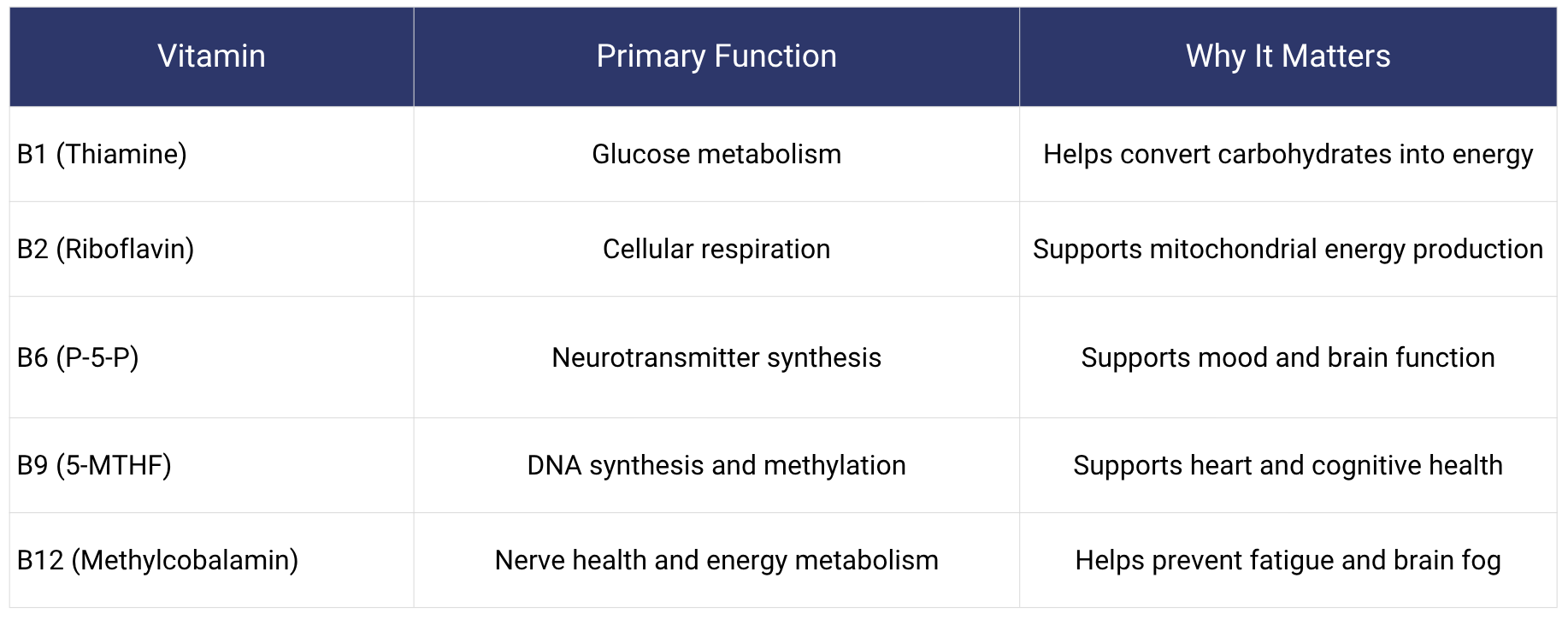 Supporting cellular metabolism with adequate B vitamins helps ensure that your body’s energy systems function smoothly and consistently.