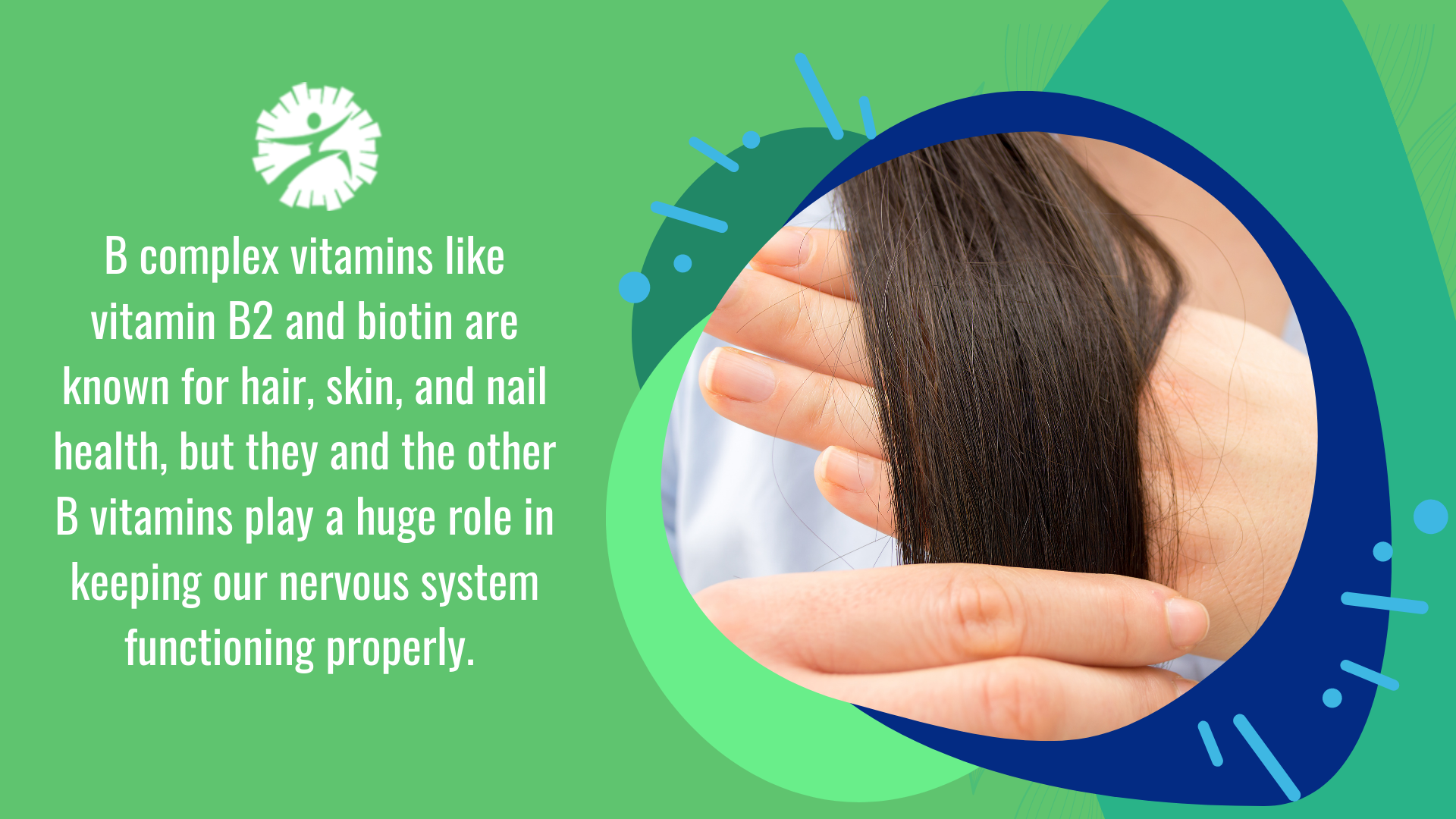 Nervous System, Hair, Skin, and Nail Health: B complex vitamins like vitamin B2 and biotin are known for hair, skin, and nail health, but they and the other B vitamins play a huge role in keeping our nervous system functioning properly. Vitamin B6 is required for the creation of almost all of our neurotransmitters, or our chemical messengers. Vitamin B12 helps keep our central nervous system healthy, while folic acid helps to prevent nerve damage and neuropathy.Â