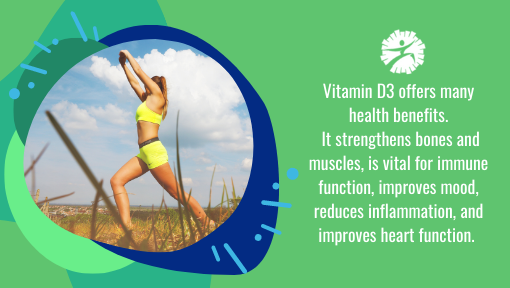 Vitamin D3 offers many health benefits. It strengthens bones and muscles, is vital for immune function, improves mood, reduces inflammation, and improves heart function. It makes sense that a vitamin we get from the sun is so powerful and necessary, just like the sun itself.