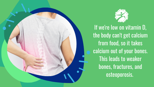 Strong muscles need healthy bones, and Vitamin D goes to work with calcium to support your bones. You see, Vitamin D absorbs calcium from the food we eat as it passes through the intestines. If we're low on vitamin D, the body can't get calcium from food, so it takes calcium out of your bones. This leads to weaker bones, fractures, and osteoporosis.